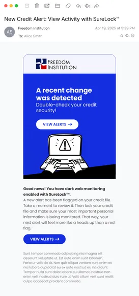 Ongoing dark web monitoring scans for exposed personal information across 20+ data types with real-time alerts if something looks compromised.