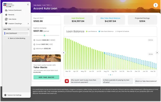 Take-Backs™ aren't just a feature. Take-Backs change loan behavior. Borrowers feel more in control, institutions see better-performing portfolios, and relationships last longer. Plus, they can be deployed strategically. Take-Backs can be offered to most installment loans, and the rates and terms are still set by you.