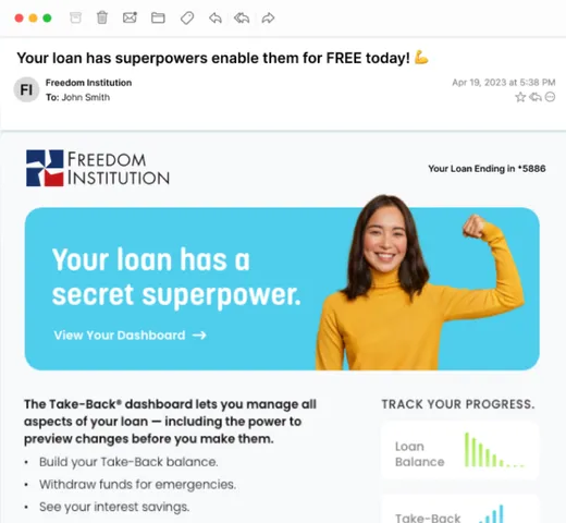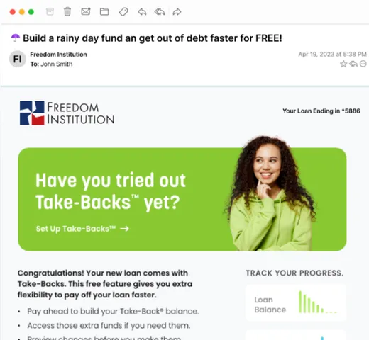 Most loan campaigns stop once the loan closes; Take-Backs are different. Our engagement strategy is designed around the full borrower journey: helping them understand the benefit at application, reinforcing it after funding, and nudging healthy habits over the life of the loan. We provide ready-to-use campaigns, emails, and push notification that consistently remind borrowers how and when to use Take-Backs™, turning a one-time promotion into an ongoing relationship driver.